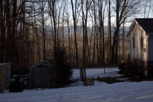 We finally found what we thought would be perfect and moved into a comfortable raised ranch on an absolutely gorgeous piece of property. As the crow flies it is only a few miles from the woods where I grew up. But it isn’t located on the valley floor as where I grew up. It’s in the foothills of the majestic Shawangunk Mountain Ridge, nestled in among the long chunks of rocks as the north side of the mountain falls down into the valley. Minnewaska State Park almost wraps right through our backyard. The woods open up into a paved drive and an oasis of a green lawn sprawls slightly uphill to the house. Then the hill continues in steeper fashion behind the house with more lawn and eventually thick woods continuing up the hill. There is thick woods on either side, for acres and acres in one direction and for a good distance in the other. The location was so peaceful and magical. A small stream ran through the woods in the back corner if we had enough rain. It was everything we wanted home to be. The quiet was so peaceful after 10 years in the small city. Now the loud noises were crows cawing loudly in the morning, barred owls hooting in the trees at night, frogs singing on summer nights, and when there was enough rain, a tranquil flowing stream just like the one I grew up next to. We could only see two neighbors houses and those are both only visible if you continue to look down the mountain, across the street and down the side road on the other side. Quite some distance away, and you can barely see them when the leaves are on the trees. Even in winter…one house is in this shot. But not close at all. You may not have noticed if I didn’t point it out. There was nothing but peace and quiet and wildlife. It was paradise. I wondered why I had ever left.