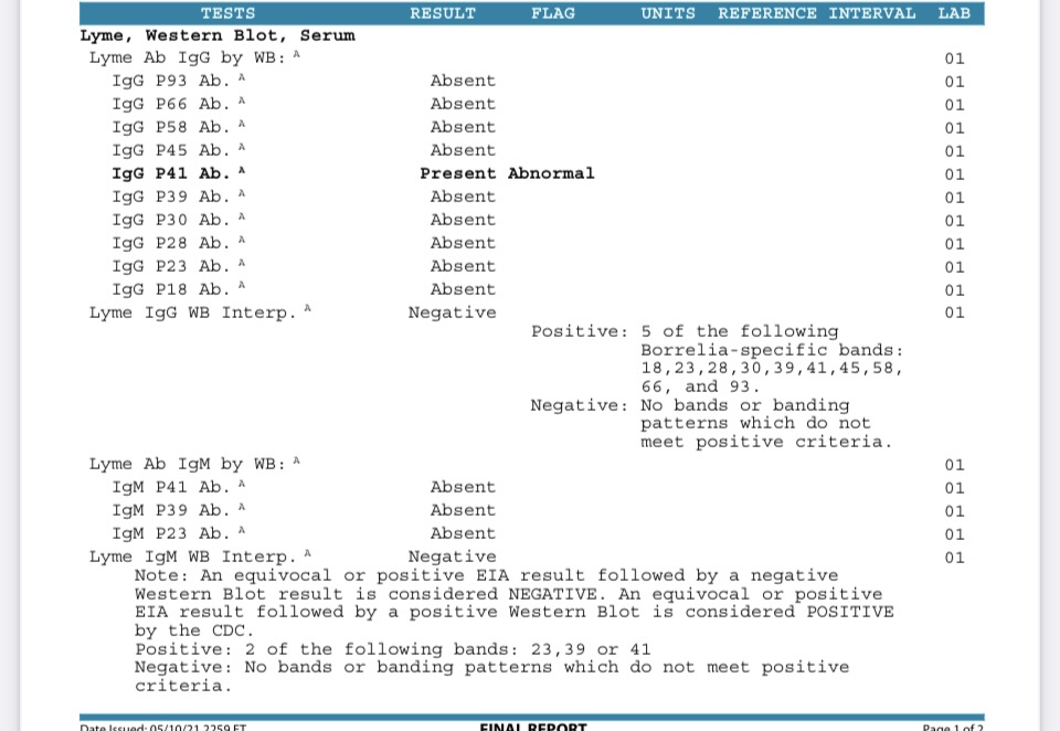 When we arrived at the ER, we found they weren’t nearly as concerned as the urgent care staff had been. I live in an endemic state, and I told them if my history of many tick bites since I moved. They slowly did various tests. Mostly in house. But a few were send outs. I have requested copies of these records, and so far have never received notes or test results that were done in house. I am able to view the labs they sent out. A western blot, an erlichia test, an ANA and a Rheumatoid factor test. All were negative except the RA, which was only a few points higher than normal range. and there was one band on my Western Blot.